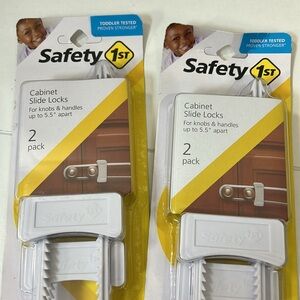 Set of Safety 1st cabinet slide locks in white and SafeFit cling shades. Ideal for childproofing and sun protection.