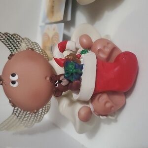 Charming set of three angel ornaments featuring gold wings. Each angel holds a festive item: a stocking, a wreath, and a gift. Perfect for holiday decor.