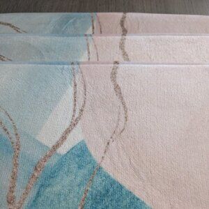 These bath mats were used only as staging for a home for sale. They are vibrant but elegant. I have put a close-up of the corner of one that has a very small blemish, otherwise, there are no rips, snags, etc. They are very plush to step on. I washed them once to get rid of any foot traffic there may have been from the showings. They were purchased online and I don't have a brand name.
