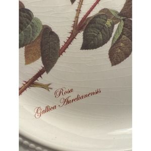 These Mid-century beauties each feature a different art print of roses in shades of red, pink, yellow and green on white, by renowned artist and botanist Pierre Joseph Redoute’. His recognizable style is detailed and realistic with full, cabbage rose-like blooms and buds. The Latin names of the plants are written in script on each plate. The borders are embossed with pretty scrolls and dots. Super fancy.
