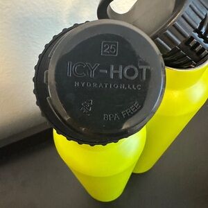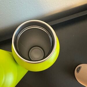 Set of two bright green water bottles with black caps. Perfect for staying hydrated on the go. Use hot or cold. Great condition. One scuffed slightly on bottom shown in photo only affecting paint.