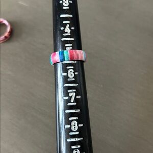Two flexible silicone rings with bright multicolor patterns. One features teal, pink, and blue stripes. The other has blended pink, orange, and gray tones. Lightweight and casual wearable pieces.