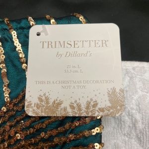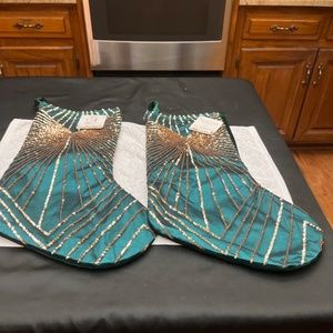 Two brand new green satin and green velvet Christmas stockings. From Dillards. Front is green satin which is covered with a delicate layer of green netting. It is then heavily sequined with gold sequins in a type of sunburst design. The back of stockings is nice quality green velvet. There is a green velvet loop hanger on each one. Extremely nice. Roomy. Trendsetter by Dillards. Tags remain on. 18 inches long. 8 inches wide through middle. 11.5 inches across toe area. Perfect condition. Set of two.