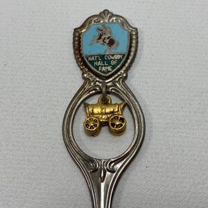 This set of two souvenir spoons from Oklahoma State is a must-have for any collector. Featuring designs inspired by the Cowboy Hall of Fame with a covered wagon and pewter spoon marked Tulsa Oklahoma. They are great for display or for use at home and will be a conversation starter for anyone who sees them. Don't miss out on the opportunity to add these beautiful spoons to your collection.