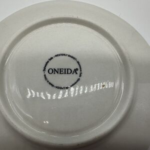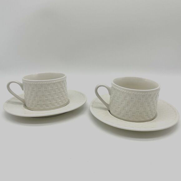 Very good condition tea/coffee cups with saucers. Listing is for two cups and two saucers. The cups stand 2 3/8 inches tall, and the saucers measure 6 3/8 inches in diameter. These pieces are in excellent condition, with no chips or cracks, and are marked Oneida Westerly Basket on the back.
