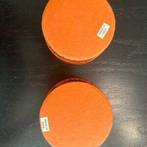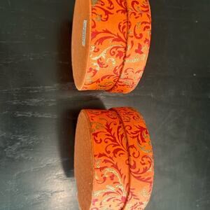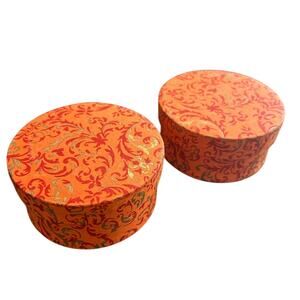 Beautiful set of two round decorative boxes. Features an intricate orange and gold pattern. Perfect for adding a touch of elegance to any space or even to use as a gift box!