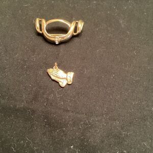 Both of these pendants are in goldtone.  One is a pair of praying hands with “Pray for Peace” on the reverse measuring 15/16” in length.  The other features. An oval loop accented with three clear stones and oval shaped bales on both sides.  It has a length of 1 3/4” and is 1” at its widest point.