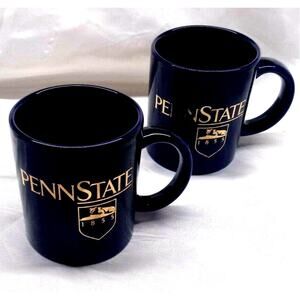 This is a set of two Penn State blue with gold coffee mugs. There are no chips or cracks. These are not microwave safe, due to the gold. They measure at 3 3/4" in height and 3 1/8" in diameter at the rim. Please look closely at all of the pictures.