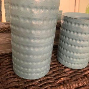 Set of two robin egg blue ceramic candle holders with slight antique glazing. Measurements are 6” and 4”. Holds a 2” candle. Both in great  condition. No chips or cracks.