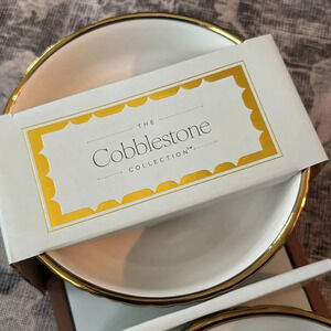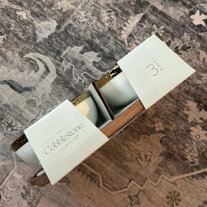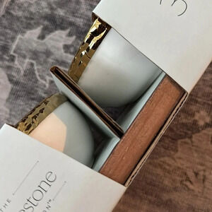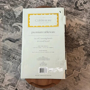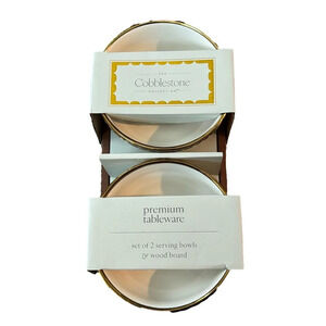 New never been used. Two white serving bowls with wood board. 5 in serving bowls. Board measures 10.75 in x 5.4 in. Bowls are microwave & dishwasher safe. Board is hand wash only.
