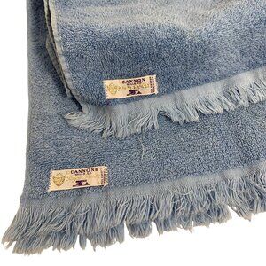 This vintage set of Cannon Mills bath towels, in a soothing blue with intricate floral designs, offers a timeless charm for your bathroom decor. Made from high-quality cotton, these towels provide both durability and comfort. Their elegant design and soft texture make them a sophisticated choice for any bathroom setting.