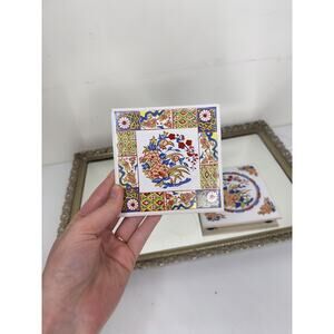 Set of Two Vintage Chinoiserie Style Coasters Trivets Tiles w/ Feet Floral