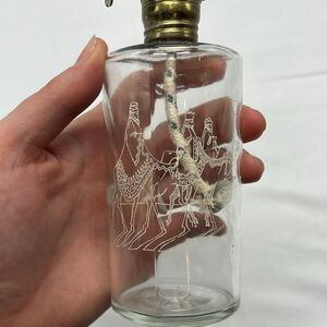 These oil lamps are super cute! They're 10 inches tall and have a 2 in diameter. One has a nativity scene and the other is the wise men on camels. Please note wise men on camels has some chipping of paint, see last picture.