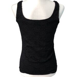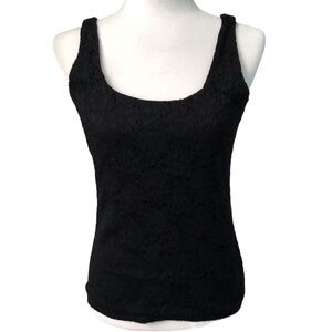 Black Tank is round neck black eyelet floral lace tank fully lined stretch tank top. Can be worn under sweaters, low tops, dresses, or on its own.