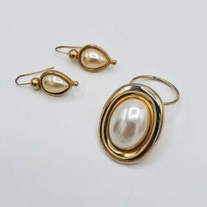 Set of Vintage Faux Pearl Gold-Tone Pierced Earrings & Scarf Clip