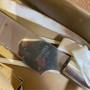 This beautiful set is in gently used condition. No flaws with the knife or server, the ribbons can be taken off or replaced with different ones. The handles are fairly lightweight but feel good when holding and look great in photos. There is some wear to the lid and the box; please see photos! Let me know if you have any questions.