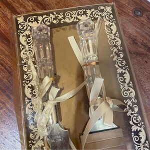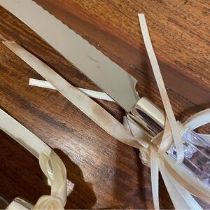 This beautiful set is in gently used condition. No flaws with the knife or server, the ribbons can be taken off or replaced with different ones. The handles are fairly lightweight but feel good when holding and look great in photos. There is some wear to the lid and the box; please see photos! Let me know if you have any questions.