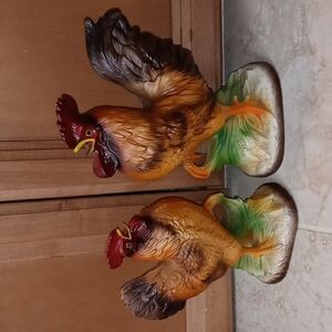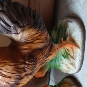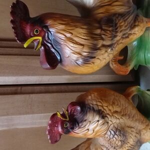 beautiful Farmhouse decor rooster and chicken beautifully done says New Orleans Japan looks to be ceramic very nice size no chips noted.