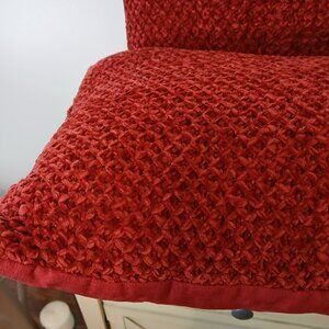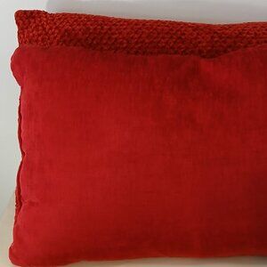 Set of dark red accent pillows (unbranded, tags removed) - 25 inches long each. Can be used reversible. One side has a textured weave design and other is plain. Has a nice light sheen to the fabric. In great shape, smoke-free home. Comes with 2 brand new wooden bead & jute Christmas ornaments.
