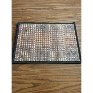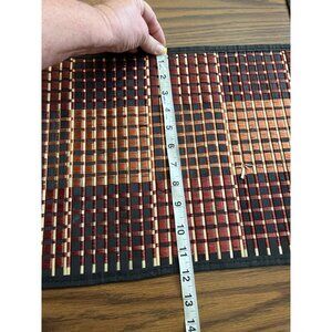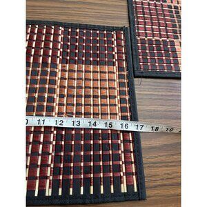 Set of four rectangular placemats 12”x17”. Has what appears to be small rattan strips wrapped with burgundy and orange thread on black background. One small rattan piece sticking out, otherwise good pre-owned condition.