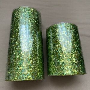 Set of 2 green sequin candles, measures 3x6 and 3x4. Both are new.