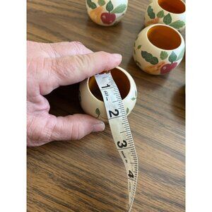 Set of six hand painted napkin rings with fruit. Has apples and vines. Cream background with orange inside. Good pre-owned condition.