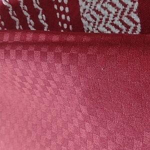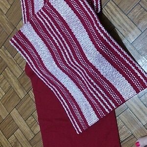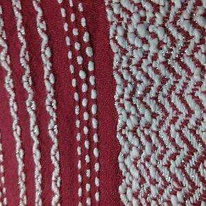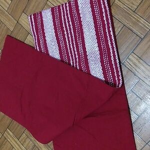 Tablerunner is a heavy woven cotton material in a striped pattern and has silver threads throughout. It has light-weight cotton lining in a solid red.