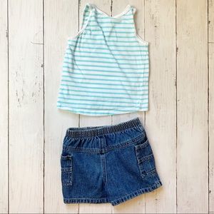 Condition: good; small stain on tank top. Snoopy design tank top; H&M Denim shorts with elastic waist. Size 3-6 months k120