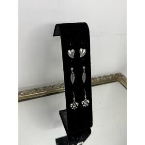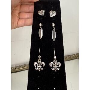Set of three Silver Tone Vintage Earrings, Silver Heart Studs, Leave Drop Earrings , Premier Designs Fleur De Lis Silvertone Drop Earrings