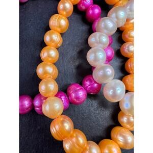 Genuine freshwater cultured pearls dyed in shades of fuchsia pink, pale pink and peachy tangerine orange strung on stretch cord. Measures for a size 7 wrist. Since these are factory strung, they will need to be restrung on more durable material at some point.