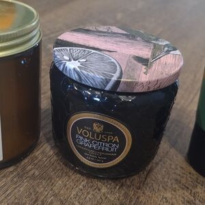 - (1) 4.5oz Voluspa candle, scent of pink citron grapefruit, hand poured cocwax.