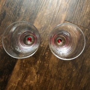Set of 2 fluted handblown glass cordial/shot glasses. In the heavier base of the glass is a deep red ball - very unique and eye-catching.