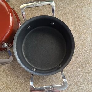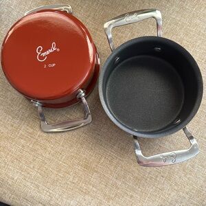 Set of two Emeril 2 cup mini Saucepans. Perfect for individual servings. Durable and stylish.