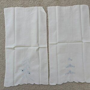These are vintage white cotton guest or fingertip towels with blue floral pattern embroidery.