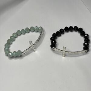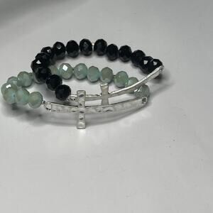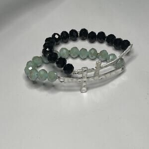 Set of two bracelets black and mint green blue stretch cross silver tone jewelry