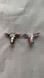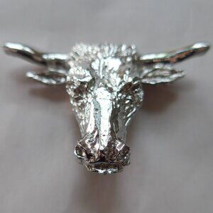 Preowned/Used. Condition is very good. This is a set of two longhorn bull bolos. They are silver toned costume jewelry. They do not come with bolo cords. Both have functioning bolo clips on the back. One is pure silver tone and the other has some black paint that has settled into the etched details. Length is 2 inches and height is 1 & ½ inches.
