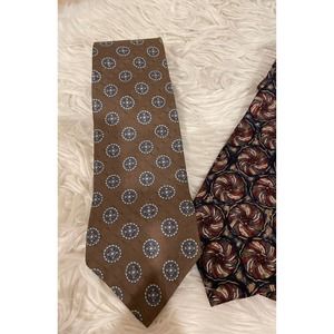 Includes Holston silk Thai olive green solid color with geometric circle design throughout tie blue with touch of white and touch of purple, Christian Dior silk Thai circular seashell design is beautiful fall colors Both ties are hundred percent silk comes from a smoke free home no rips or snacks