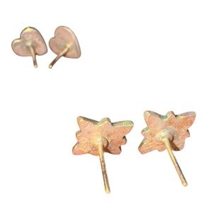 The image shows four stud earrings. Two of them are heart-shaped with a turquoise stone inlay, and the other two are star-shaped with a red turquoise in the center and turquoise accents.