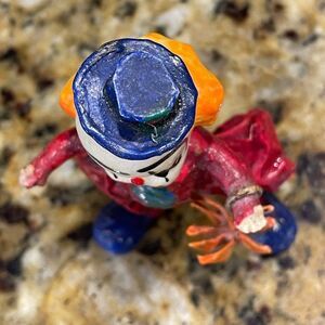 The other Clown is 3.5 inches tall (with his percussion instrument) and is holding a guiro in one hand and the mallet for playing it in the other. He has blue “Bozo” style hair and the same style large collared outfit in yellow.