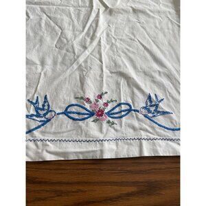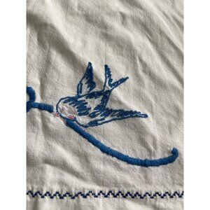 Set of two white pillowcases with embroidered birds and flowers. Has blue stitching around perimeter of opening. Good pre-owned condition.