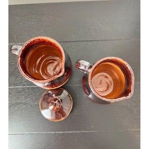 Set of vintage cream and sugar pottery with lid. Marker in last pic for scale/size. Please let me know if you have any questions!