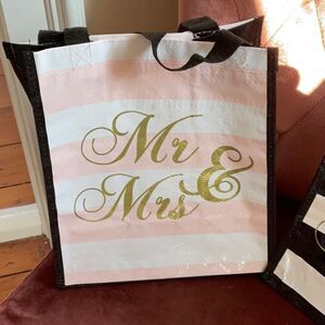 Never used but a tad wrinkled from being on suitcase on honeymoon. Super cute and chic wide French Parisian stripes, mr. & mrs small tote bags.