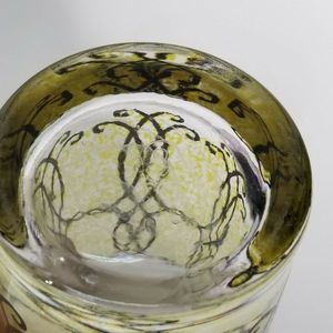 Neat flashed, textured yellow glass with a black design over the yellow.