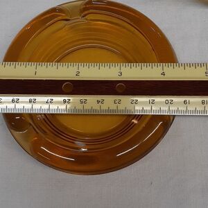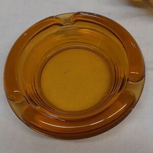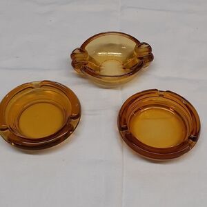 Set of 3 Vintage 4" Round Amber Glass Cigarette Ashtrays, MCM, 3 Slots (and 4 slots on the heavier one.) All preowned. No chips, or cracks. In great condition.