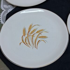 Set of 4 Elegant Wheat design 9" dinner plates from Homer Laughlin Golden Wheat dinnerware collection. This pattern with its distinctive golden wheat design and 22K gold trim was a popular premium in Duz detergent boxes during the 1950's These dishes made in the USA are oven proof. All are preowned and in good condition. No chips or cracks.