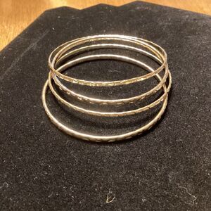 Set of 4 textured bangle bracelets, all having an inside diameter of 2 3/4” . All will fit through an 8” wrist. Please zoom in to see the pretty hammered texture look and have a 2/16” width of band itself.