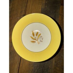 This image showcases a vintage Homer Laughlin "Autumn Gold" platter set, known for its yellow rim and wheat sheaf design. This pattern, produced for Century Service Corp of Alliance, Ohio, was popular in the 1950s.