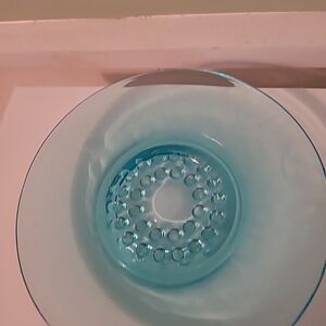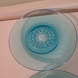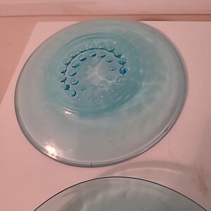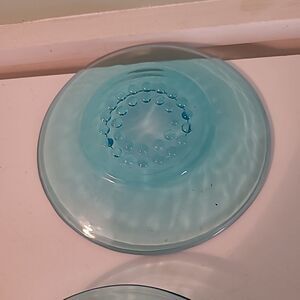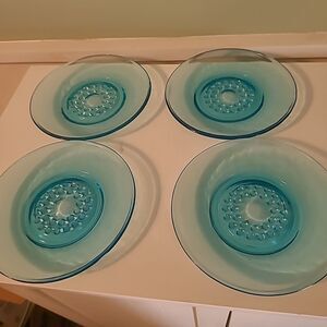 Pre-owned in good condition. Set of four turquoise with a bubble/hobnail pattern. They are approximately 6inches in diameter.
