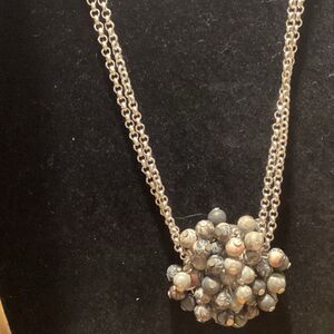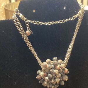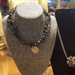 One necklace is a choker length of double strands of grey stone nuggets with a hook and eye clasp and a mother of pearl center pendant. This necklace measures 16” in length + 1” diameter of the mother of pearl piece. The second necklace by Viva has a double strand silvertone chain and lobster claw clasp.The pendant at the end of the chain has many small grey beads and a 2” diameter.