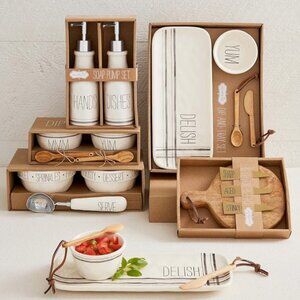 Bistro "Yum" & "MMM" Dip Bowl Set includes two hand-painted ceramic dip cups and two grommeted wooden spoons. One bowl features the phrase "MMM" and the other bowl reads "YUM". Comes boxed ready for gifting!